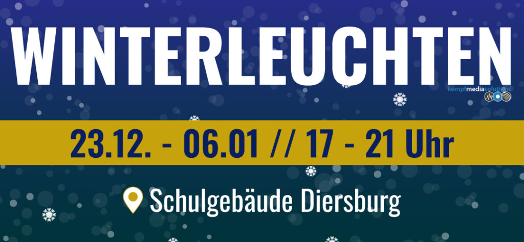 Das WINTERLEUCHTEN findet im Zeitraum vom 23. Dezember 2025 bis 06. Januar 2026 jeweils von 17-21 Uhr am hinteren Gebäude der Grundschule Diersburg statt. (Wegbeschreibung)